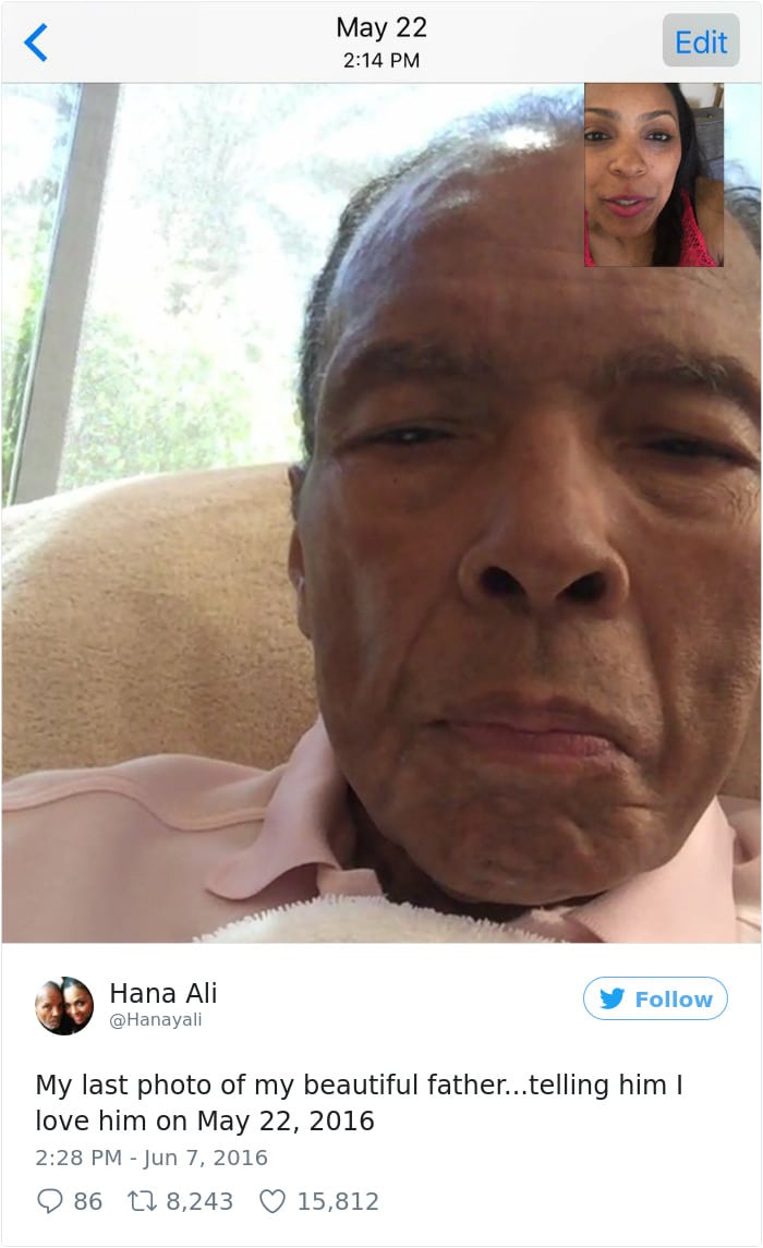 Essa foto foi tirada no dia 22 de Maio de 2016 durante uma conversa com sua filha. O lutador morreu no dia 2 de junho de 2016 por causa de uma doença respiratória.