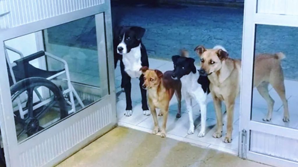 Gangue de cães faz plantão na porta do hospital para esperar morador de rua.