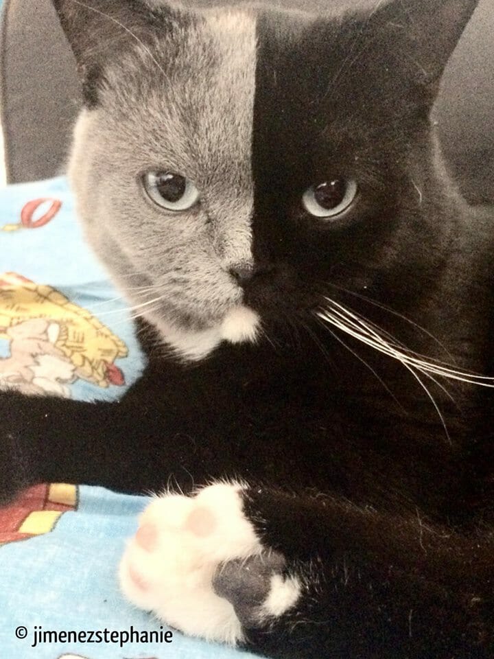 Ninguém gosta de uma pessoa “duas caras”, não é? Esse termo geralmente é dado a alguém falso, mas no caso desse gatinho, é bem diferente. Bom, ele é duas cara, sim, mas da forma mais fofa. Isso porque Narnia, que nasceu em março de 2017, tem o rosto com duas cores: metade cinza e metade preto. Narnia é um gato de pelo curto inglês e vive em Paris com sua dona, Stephanie Jimenez.