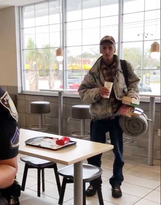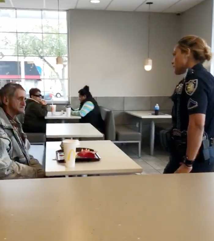 Os homens estavam em mesas separadas, até que uma policial foi até a mesa do morador de rua e lhe disse algumas coisas terríveis. A oficial pediu ao homem para que comesse o mais rápido possível e saísse do local.