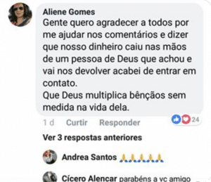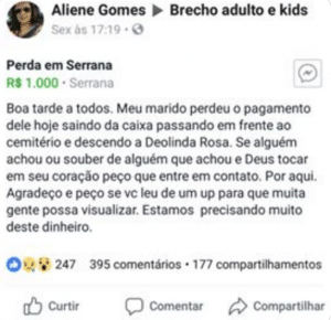 Desesperada com a situação, sua esposa Aliene Gomes foi para as redes sociais procurar ajuda. Ela anunciou em diversos grupos da região a perda do dinheiro e chamou a atenção de muita gente.