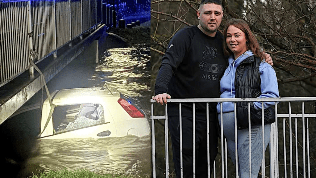 O jovem de 28 anos não apenas caiu da ponte e quebrou a janela traseira do passageiro, como também o pai, de raciocínio rápido, usou correias de catraca para amarrar o Fiat à ponte e impedi-lo de afundar.