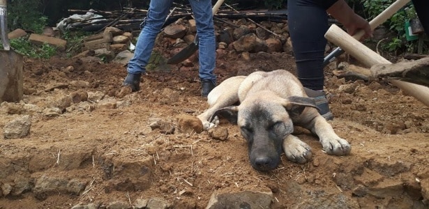 Assim que as equipes de resgate chegaram, uma cena comovente chamou a atenção de todos ali presentes. Um dos cães da família, Jacinto, havia se deitado ao lado da casa de seus donos. E nada nem ninguém era capaz de tirá-lo de lá.
