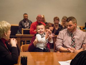 Depois que o juiz leu o decreto de adoção e apresentou seu novo sobrenome legal, a criança olhou para Tyler e disse: “Papai!”, pela primeira vez e ainda bateu palmas.