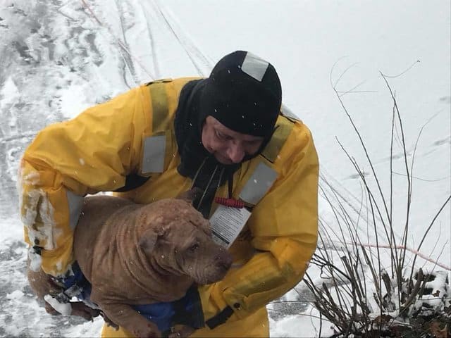 A temperatura estava caindo cada vez mais e a situação não estava nem um pouco fácil para Lilly. “Estávamos na estação, que era uma vantagem, então fizemos algumas tarefas rápidas. Um dos rapazes começou a vestir um terno seco imediatamente antes mesmo de deixar a casa de bombeiros “, Hudson disse ao The Dodo. Rapidamente, com a ajuda de mais alguns bombeiros, eles se uniram para começar a tentar retirá-lo da neve.