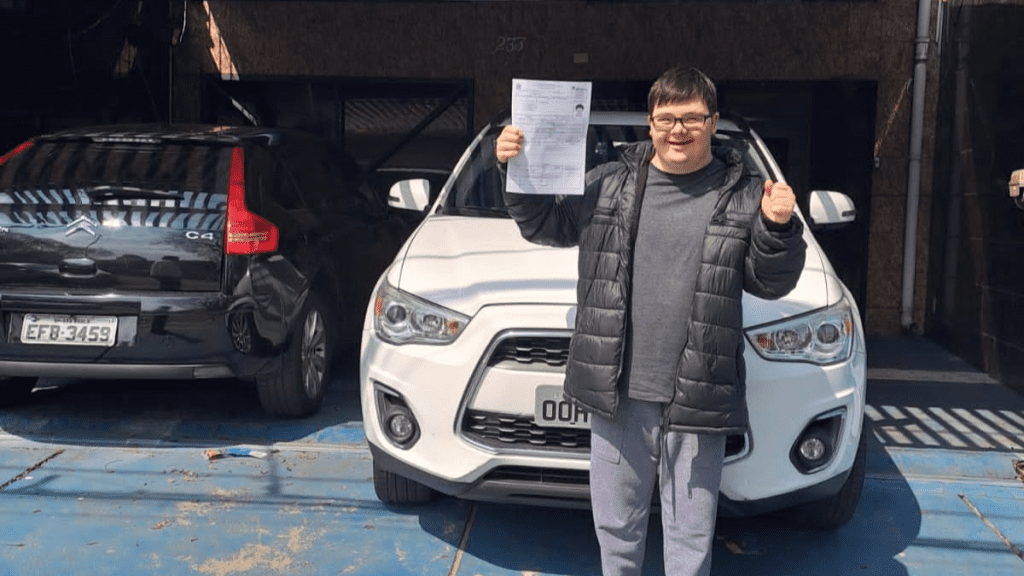 O Caio tem síndrome de Down, já passou no teste psicotécnico e, recentemente, começou as aulas de legislação: “Eu tenho a vontade de tirar a CNH há muito tempo. Meu objetivo é poder viver de forma independente, e ter a CNH é essencial para alcançar essa meta. É isso que almejo para o meu futuro, ter controle sobre minha vida”.