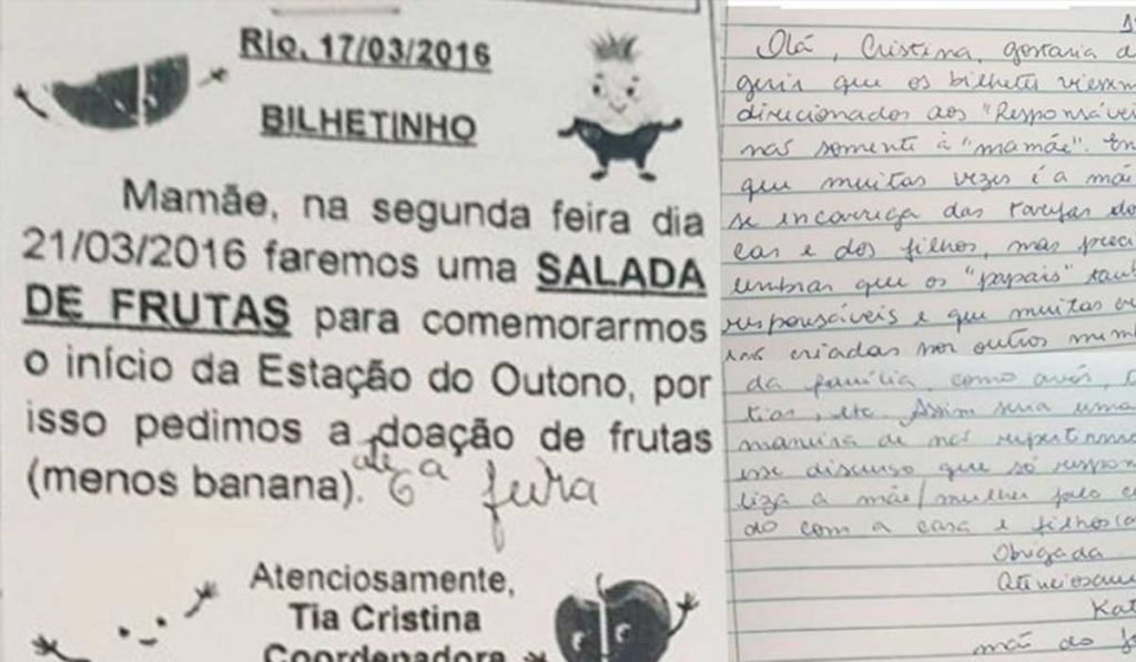 “Gostaria de sugerir que os bilhetes viessem direcionados aos ‘responsáveis’, não somente à ‘mamãe’. Entendo que muitas vezes é a mãe quem se encarrega das tarefas domésticas e dos filhos, mas precisamos lembrar que os ‘papais’ também são responsáveis e que muitas crianças são criadas por outros membros da família, como avós, tios, tias, etc. Assim seria uma maneira de não repetirmos esse discurso que só responsabiliza a mãe/mulher pelo cuidado com a casa e filhos (as). Obrigada.”