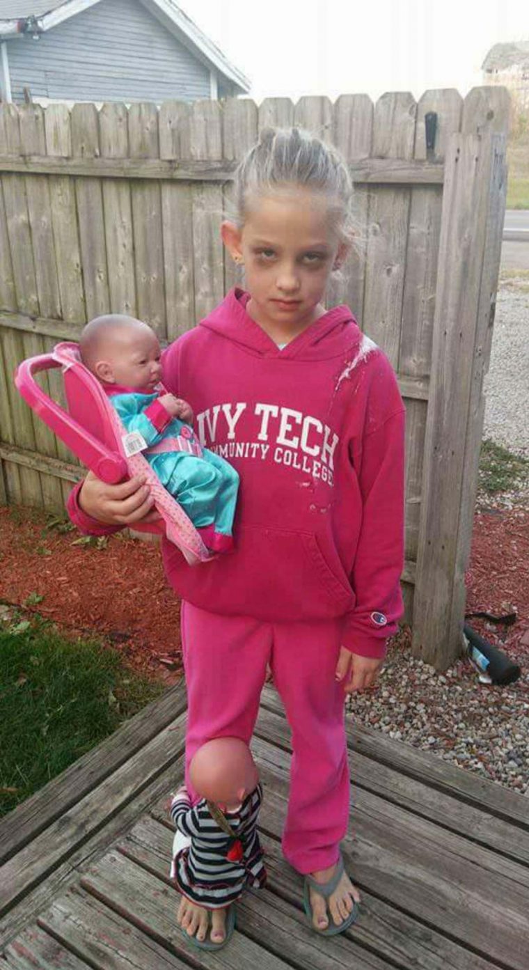 Ela colocou um boneco no colo e outro na perna, para simular a dedicação da mãe com seus filhos. Para demonstrar o cansaço de sua mãe e simular olheiras, a menina também passou maquiagem em seus olhos.
