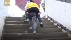 Nas imagens, que são de aquecer o coração, é possível ver os dois trabalhando como um time. Enquanto ela o carrega, o jovem segura o guarda-chuva.