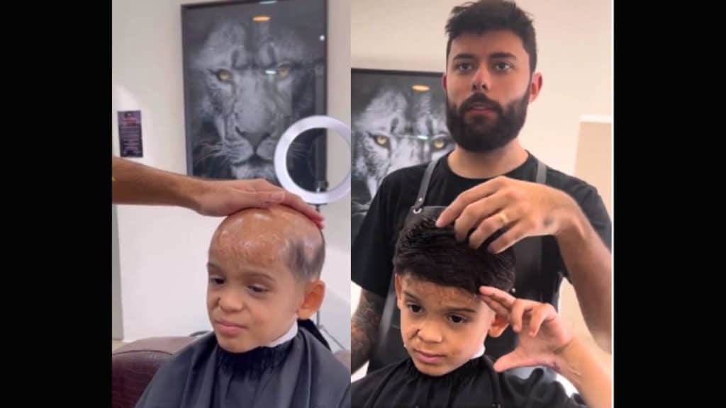 Um estúdio capilar realizou o sonho e deu uma prótese a um menino, de 6 anos, que sofreu queimadura na cabeça e perdeu todo o cabelo. A emoção dele ao se ver com topete e um corte da moda não tem palavras! (vídeo abaixo)