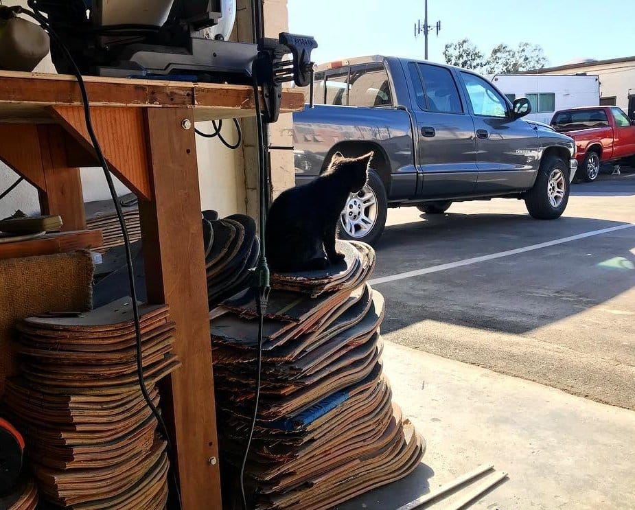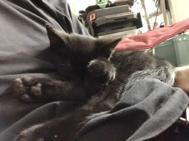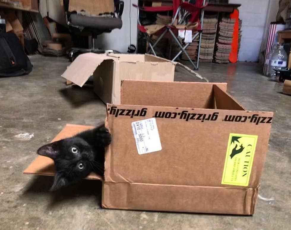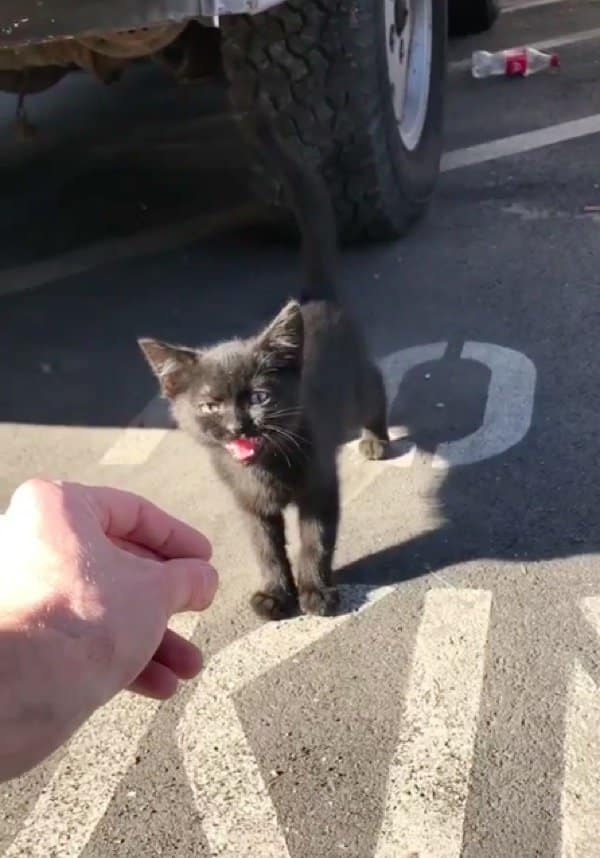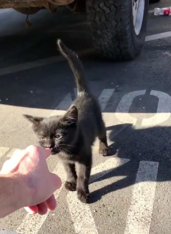 Um homem encontrou um pequeno gatinho preto perto de sua marcenaria em Long Beach, Califórnia (EUA). Imediatamente, o felino gostou do rapaz e caminhou até ele, miando para chamar sua atenção, claramente procurando por comida.