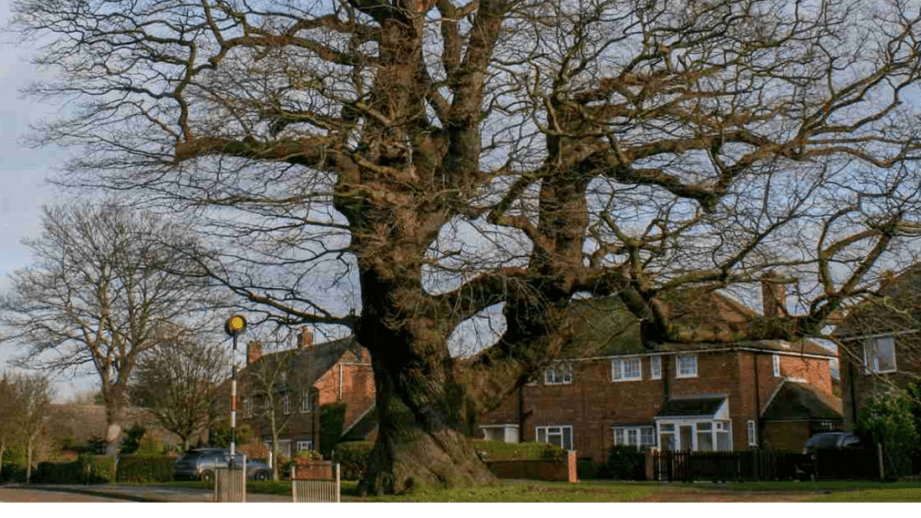 Nos séculos passados, a metade superior da árvore era rotineiramente podada para forragem e lenha, uma prática que aliás ajuda as árvores a viver mais tempo. As árvores cortadas dessa maneira, chamadas de “pollarding” , geralmente desenvolvem formas bizarras que parecem completamente fora de sincronia com a floresta circundante. Não há problema com esta árvore, já que o bairro onde ela se encontra foi construído em arco em torno do magnífico carvalho.