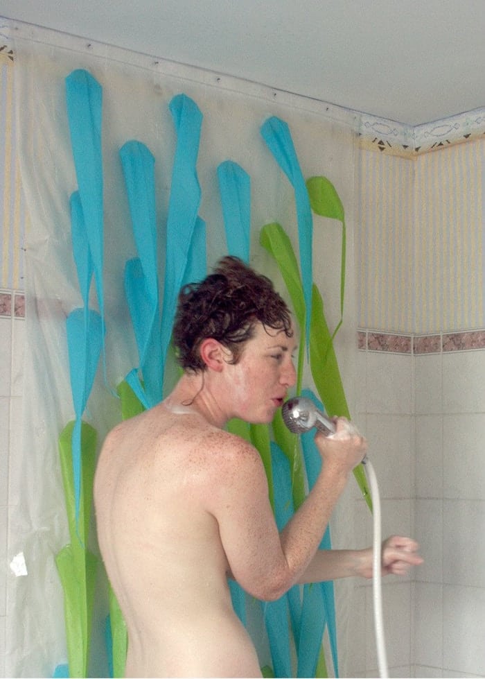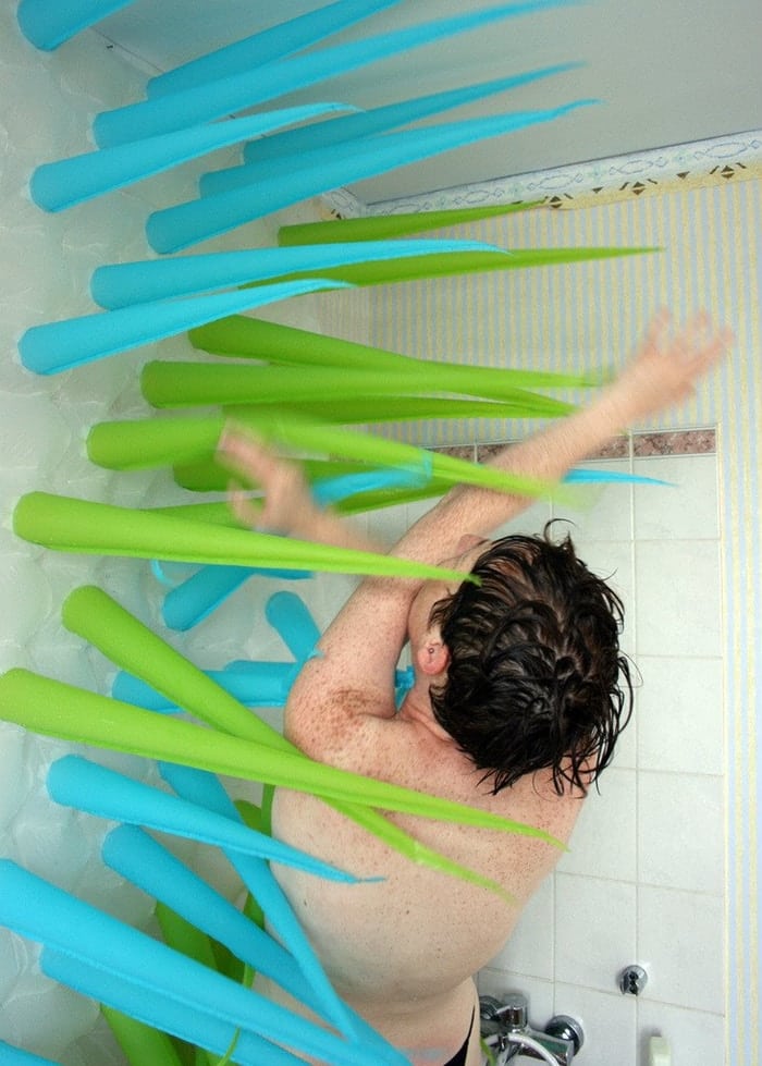 Uma artista plástica chamada Elisabeth Buecher teve uma ideia brilhante e descontraída para “avisar” aos demorados que está na hora de sair do banho. É muito simples! Uma espécie de cortina com pinos de ar ficam atrás do chuveiro enquanto as pessoas tomam banho.