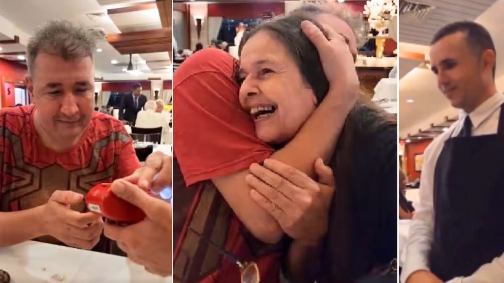 Fábio escolheu um restaurante bonito e não muito cheio. Um amigo filmava o momento e para descontrair, brincou com mãe e filho. “Se soubesse, tinha pedido mais sobremesa”, disse o “cinegrafista”. “Momentos de tensão”, acrescentou ele no vídeo.