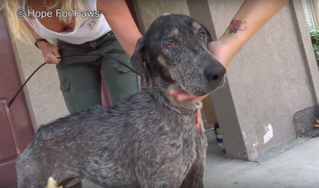 A equipe encontrou uma pobre cadelinha que não estava falecida, mas que estava em péssimas condições. Extremamente desnutrida, ela enfrentava uma dura realidade de fome e sede. E também sofria de alopecia (perda de seu pelo). Eles sabiam que precisavam ajudá-la.