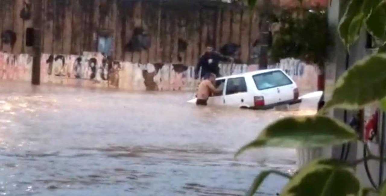 Tudo aconteceu em frente a um posto de combustíveis no Jardim Santa Cruz. Em cima do carro, em meio ao alagamento, estava o homem gritando. Logo depois, Anderson se aproxima, amarrado pela cintura para não ser levado pela água.