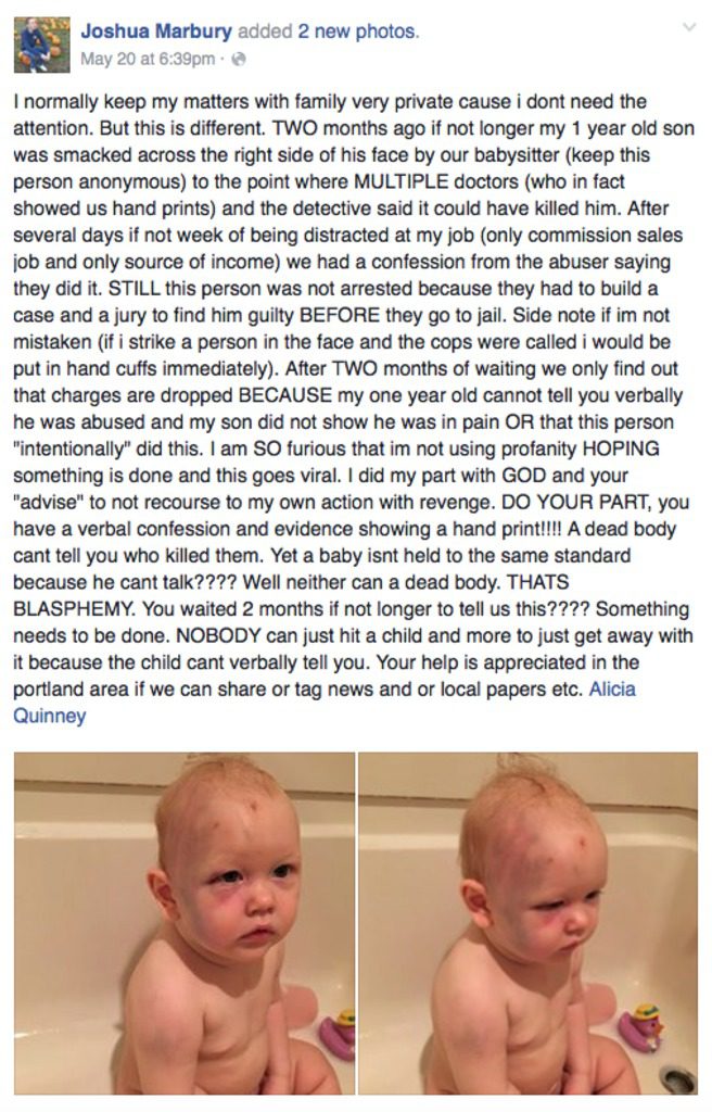 Algo tem que ser feito. NINGUÉM pode bater em uma criança e sair impune porque a criança não pode te dizer verbalmente. Eu agradeceria sua ajuda na área de Portland se nós pudéssemos compartilhar isso ou marcar os jornais locais, etc.”