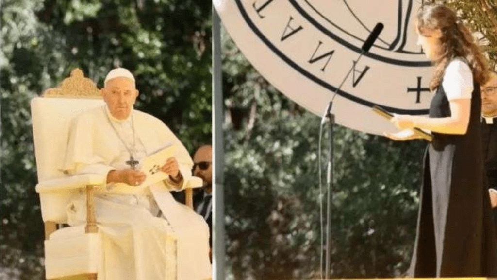 Antes do discurso do papa, após a interpretação de uma peça musical e a saudação de boas-vindas da professora Isabel Capeloa Gil, reitora da Universidade Católica Portuguesa, foram dados dois testemunhos, um inspirado na Laudato si’ e outro no Pacto Global pela educação.