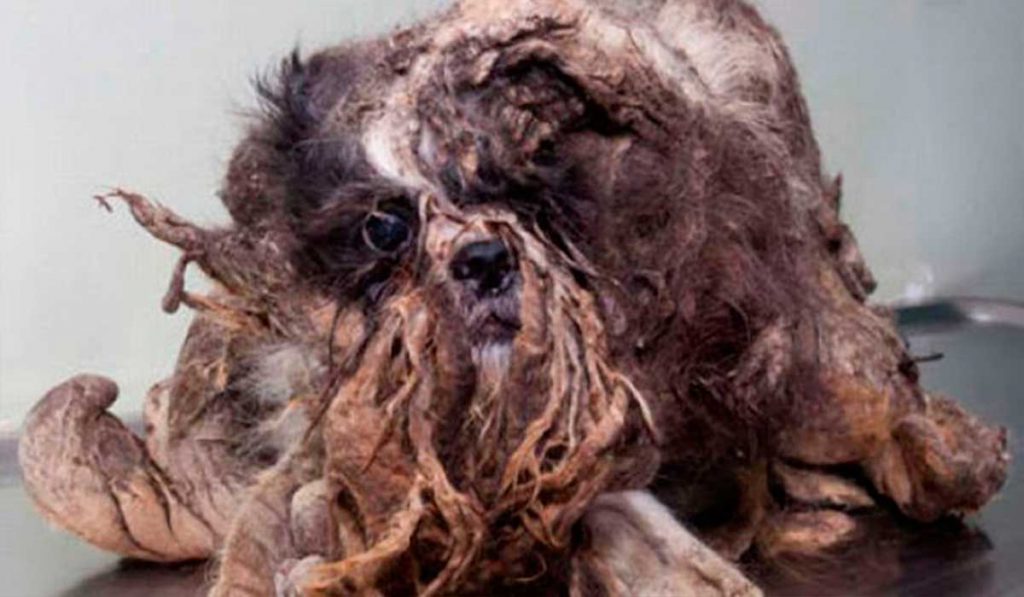 Um grupo de proteção animal do Canadá, chamado Quebec Society for the Protection of Animals, encontrou esse cachorro da foto abaixo vivendo pelas ruas. Ele quase não foi reconhecido como um animal, pois foi confundido como uma pilha de lixo.