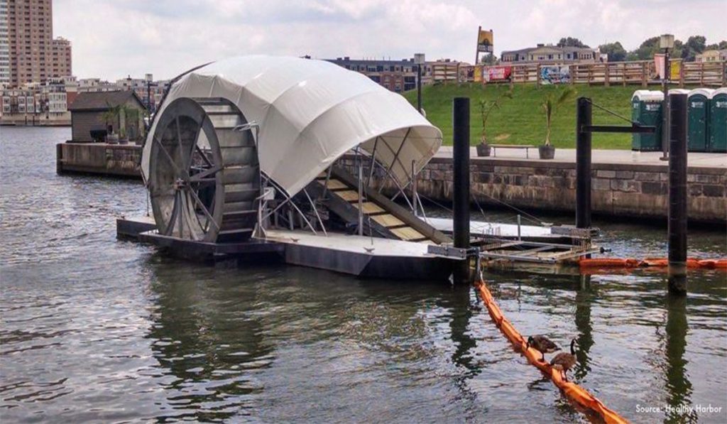 Uma tecnologia simples e inovadora pode ir longe. “Sr. Rodas de lixo” e uma roda d’água que funciona por energia solar em Baltimore. A roda é responsável por limpar a água dos portos e fica na borda desses locais e já foi responsável por tirar milhões de cigarros da água. Essa invenção retira o lixo e manda para um compartimento adequado que enviará esse material para locais de descarte apropriados, o que potencializa para que a roda gire é a corrente do rio.