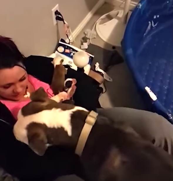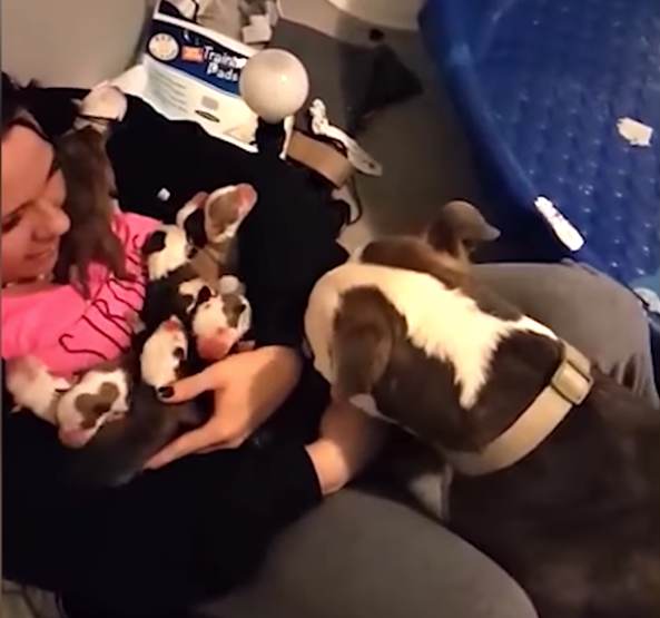 Uma vez que todos os bebês nasceram e foram limpos, a pitbull sofreu de ansiedade, algo que atinge muitas mães humanas. Foi quando, de repente, ela levantou-se e começou a levar os bebês para a mãe adotiva, como se fosse um presente – ou então “veja meus filhos, mamãe”.