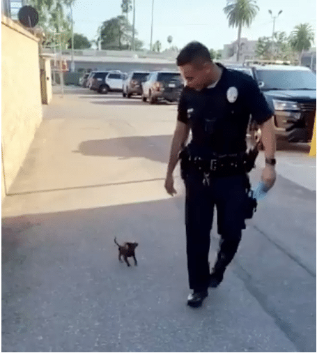 Os agentes Market e Tavera do Departamento de Polícia de Los Angeles durante uma patrulha perto de Hobart Boulevard, viram um minúsculo cão andando sozinho pelo local e resolveram resgatá-lo e levá-lo à divisão policial de Hollywood.