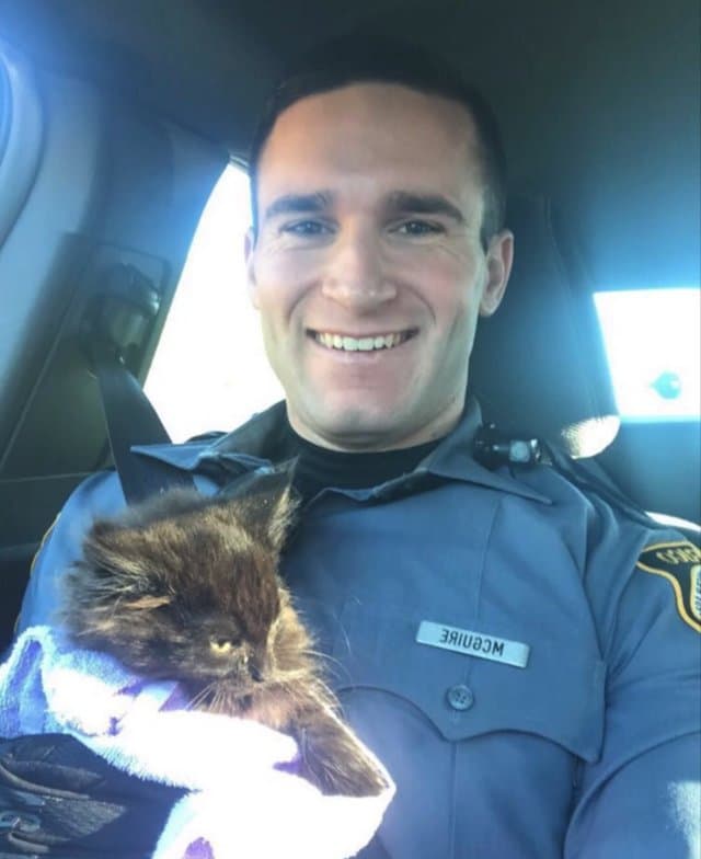 Como as imagens do incidente mostram, a prioridade de McGuire era dar segurança ao gatinho. Depois de envolvê-lo em uma toalha e confortá-lo, o oficial da polícia levou o felino para um abrigo de animais, mas acabou o adotando logo depois.