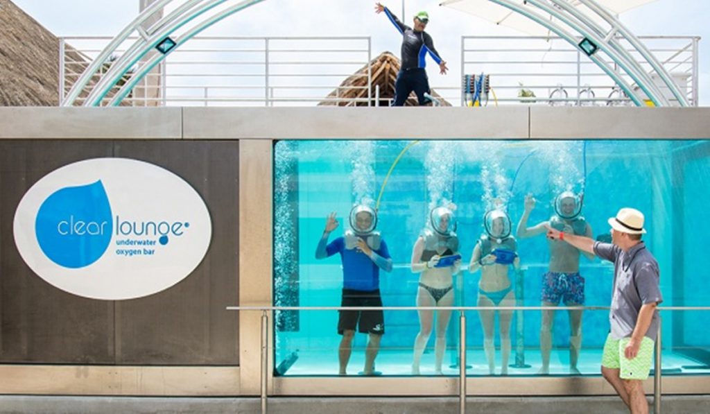 Imagine o calor que tem feito em muitas cidades do país nesses últimos dias, você sai do seu trabalho cansado e suando para fazer um happy hour com seus amigos e acaba num bar dentro de um aquário abastecido com 13 mil galões de água! Isso pode até parecer uma ideia absurda de momento, mas é exatamente a proposta do primeiro bar subaquático do mundo. Na ilha de Cozumel, no México, é possível toma drinques que fogem do padrão convencional e que não geram nenhum tipo de ressaca. É uma mistura de ar aromatizado que vem num capacete bem diferente e que proporciona sensações refrescantes e possuem propriedades terapêuticas. Existem também smoothies de vários sabores que são servidos por um barman que faz uma infusão de oxigênio.