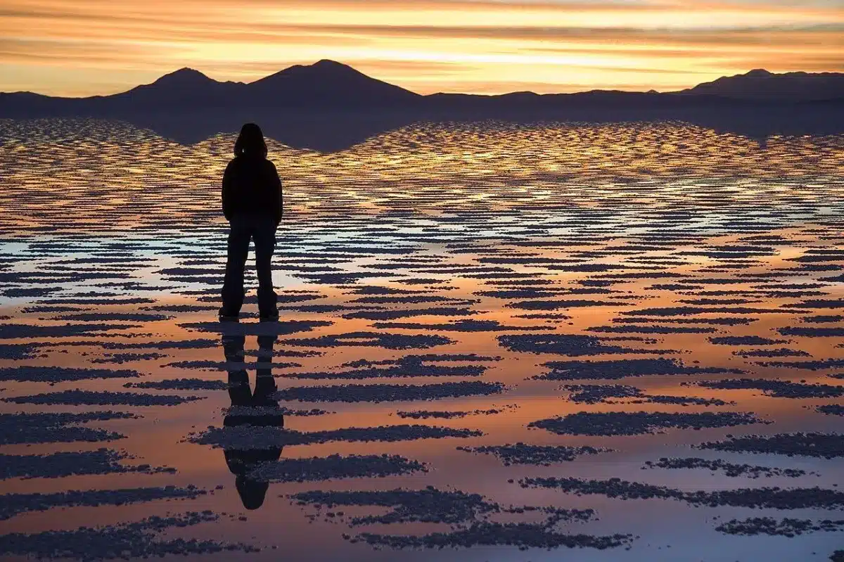 Durante a temporada de chuvas no altiplano andino, a água que se acumula na superfície do salar cria uma camada rasa e perfeitamente plana. Como o terreno é composto por sal extremamente branco e reflexivo, a água parada atua como um espelho, refletindo o céu, nuvens, estrelas e o pôr do sol de forma tão precisa que parece uma ilusão óptica.