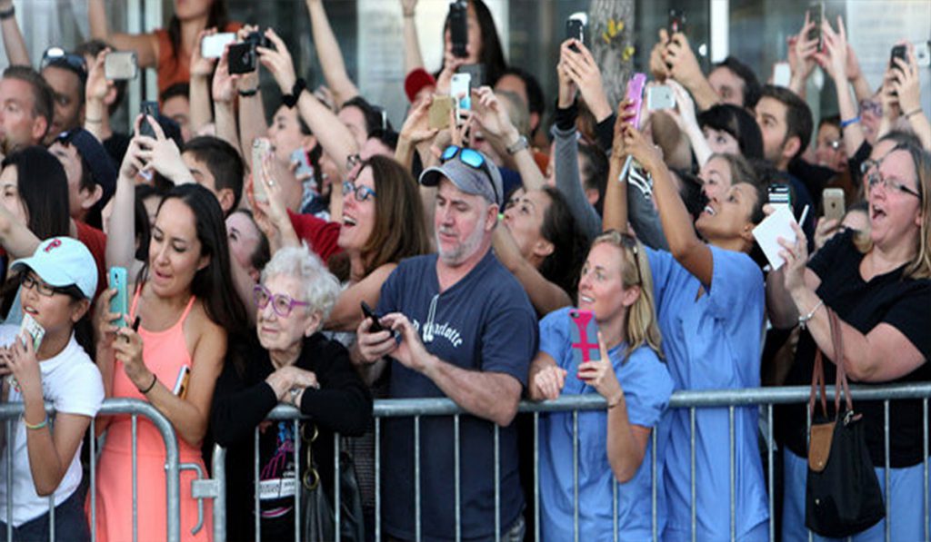 Essa foto foi tirada pelo assistente de fotografia Jonhn Blanding, que estava ao lado do Coolidge Theater, em Brookline, Massachusetts, no último mês de Setembro. As pessoas esperavam as estrelas do filme “Black Mass”, aqui no Brasil chamado de “Aliança do Crime”. Ainda que essa imagem pareça apenas um aglomerado de pessoas, se você reparar, existe uma senhora que não tem nenhum tipo de aparelho e está curtindo o momento. De um jeito simples e feliz. A foto foi compartilhada pelo usuário do Twitter Wayne Dahlberg, e rapidamente se tornou viral com mais de 9.000 compartilhamentos.