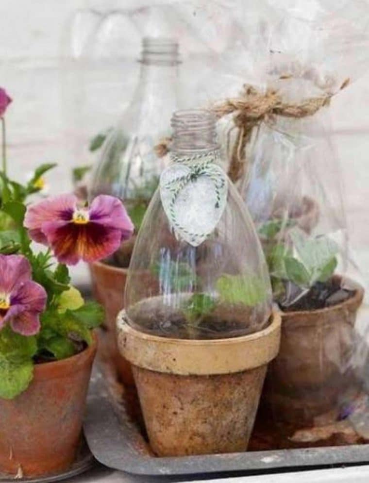 Além de ser a base de um vaso, garrafas pets também podem ser o protetor das plantas. Ou seja, impedindo que as folhas sejam atingidas pelo frio e pela umidade excessiva.