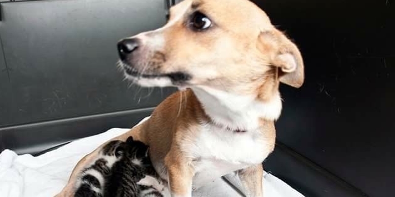Cadela é flagrada no abrigo em que vive cuidando de gatinhos como se fosse a mãe deles