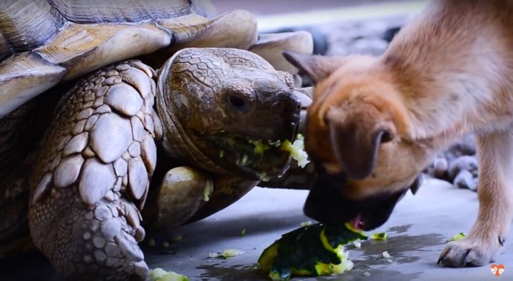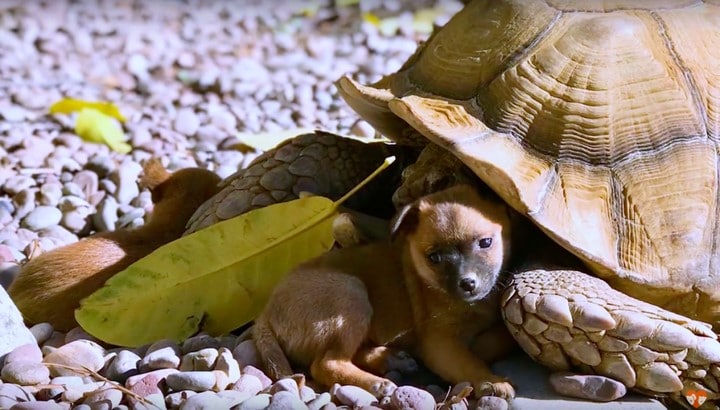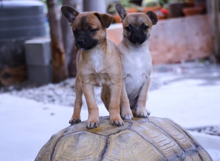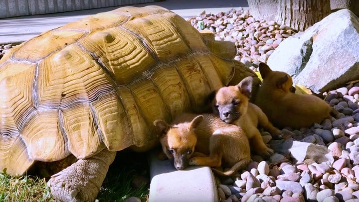 Esses quatro irmãozinhos comem juntos, brincam juntos e a tartaruga os diverte ao levá-los em passeios em seu grande casco. É uma relação de proteção e amor nessa linda família que se formou.