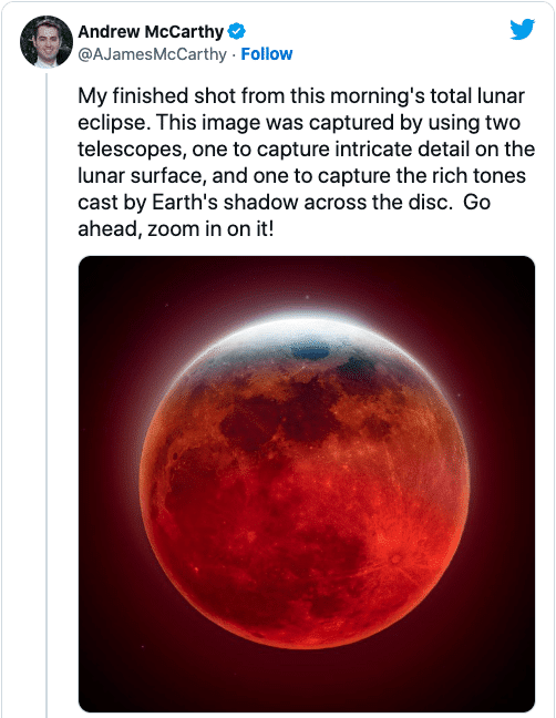 O astrofotógrafo Andrew McCarthy criou esta incrível imagem composta, mostrando a lua em vários estágios do eclipse ao longo da noite.