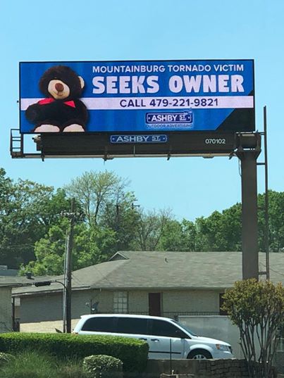 Eles apelidaram o urso de “Teddy Bear Doe” e colocaram um outdoor para espalhar o aviso do pequeno brinquedo perdido. “A vítima do furacão de Mountainburg procura o proprietário”, diz o cartaz. A empresa de publicidade também postou no Facebook as palavras: “Esse rapaz não pode suportar ficar sem sua família. Ele foi encontrado por nossa equipe de instalação em um outdoor da Ashby Street em Mountainburg depois do tornado”.