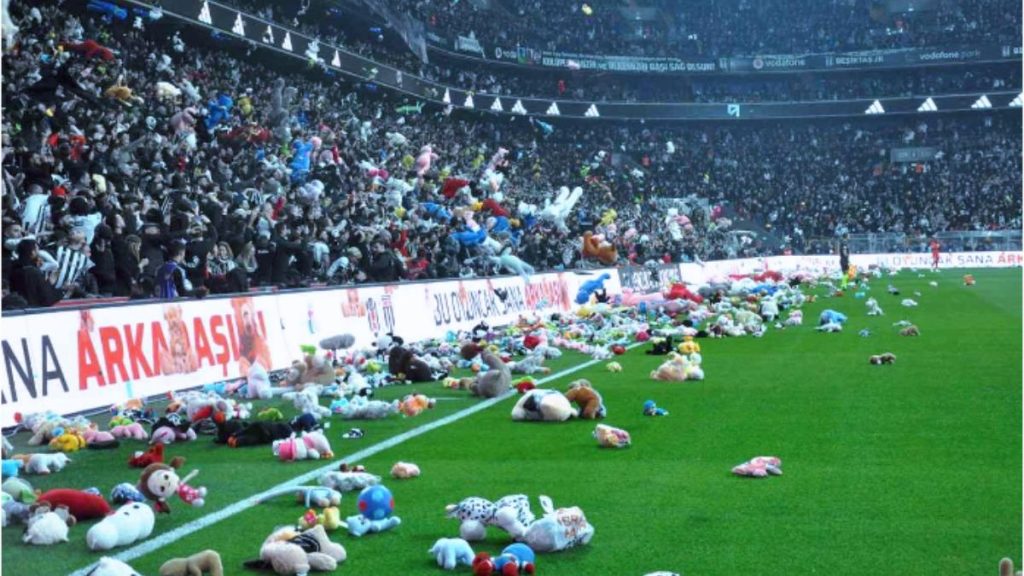 Em um momento de grande emoção, o estádio de futebol de Istambul, estava lotado, quando começou a chover ursinhos de pelúcia no campo. Todos par a doação e apoio às crianças afetadas pelos terremotos.
