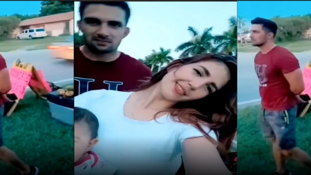A jovem cubana, Fany Espinosa, mostra seu apoio ao marido enquanto ele vendia abacates em uma das ruas de Miami.