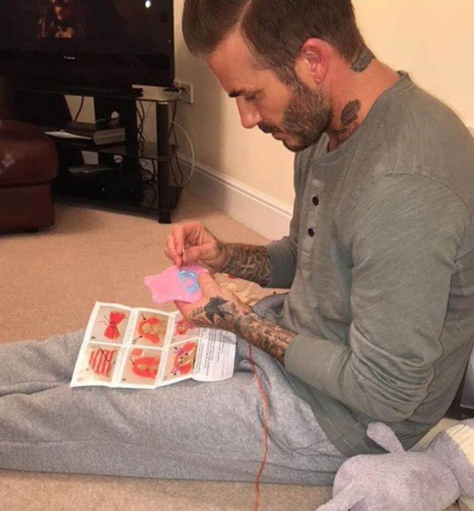 Sua esposa, a cantora e estilista Victoria Beckham, flagrou o marido fazendo algo inusitado e resolveu compartilhar com todos no Instagram: David, sentado no chão, costurava vestidinhos para as bonecas de sua filha mais nova, Harper.
